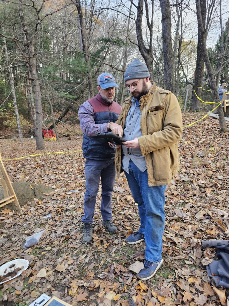 An Independent Archaeological Consulting employee recording a shovel test pit (STP) using the ARC Field Agent software